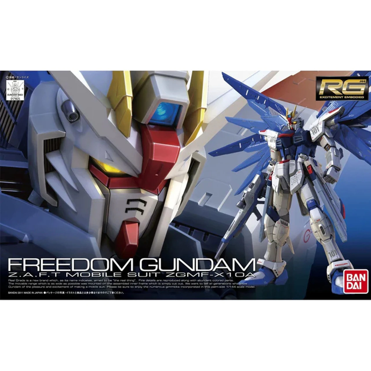Based on the Mobile Suit Gundam SEED anime, the Freedom Gundam model kit is in 1/144 scale and becomes a fully articulated figure once complete. The Freedom Gundam also includes interchangeable hands for holding different weaponry. Special marking stickers are provided to simulate the realistic placement of maintenance hatches and ports.