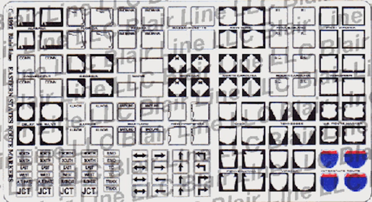 State highway route markers for 48 states plus Interstate and U.S. Highway markers printed in full color on plastic. Each set includes scale posts and a set of number decals to make your own highway number signs. Eastern U.S.A. set includes states east of the Mississippi River. Signs designed on CAD to Federal Standards, then printed on plastic for very easy assembly. Each set includes signs as illustrated and scale posts. You cut out the signs you want, attach to the scale post, and install on your layout. These signs will make your layout more realistic. Highway and railroad right of way signs really add the finishing touch to your layout. Try some today!