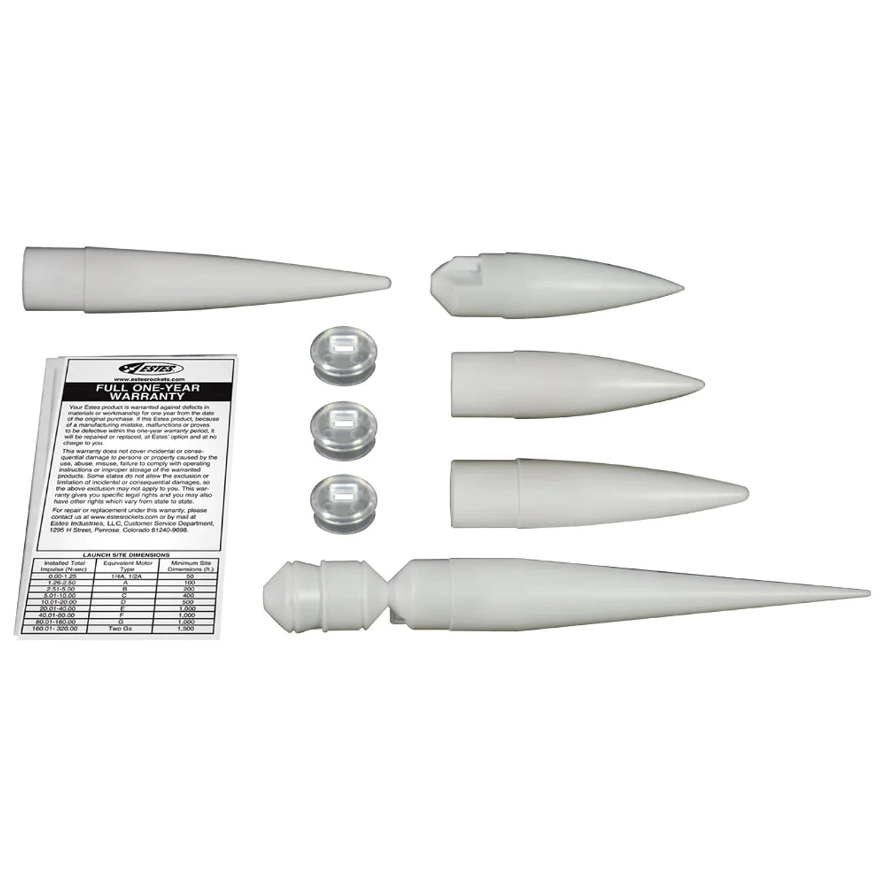 Each package of nose cones contains five nose cones that will fit the BT-50 body tubes. All have eyelets or nose cone pins for shock cord and shroud line attachments.
