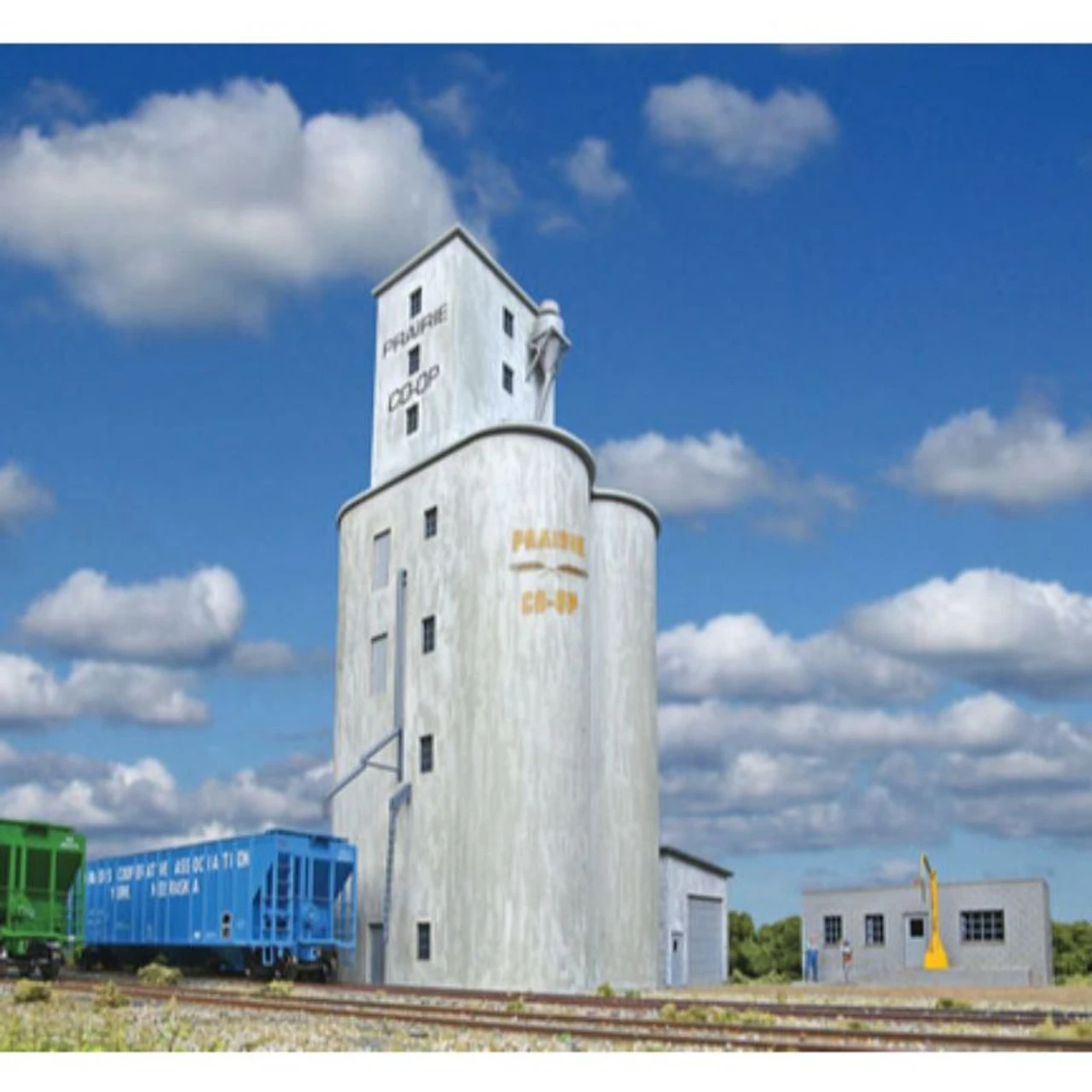 Grain elevators come in all shapes and sizes and the Walthers Cornerstone Prairie Co-Op Elevator kit will add variety to your grain handling scenes. Based on small-town producer elevators small four-silo structures can often be seen standing tall next to their wooden predecessors or related feed mills. Prairie Co-Op Elevator receives grain by truck and ships it out in covered hoppers or, in the late steam and classic diesel era, in grain-door boxcars. This kit includes the silos and headhouse, unloading shed, truck scales and various details to add realism to your layout’s grain siding. Classic small town terminal elevator Typical of concrete elevators in use from 1915 to today Used with all types of grain Square design with four silos Off-center head house Cement block unloading shed Cement block office with truck scale Loading spouts for boxcars and covered hoppers Separate dust collector, vents and sampling arm Molded in white, light gray and clear plastic Measures Elevator & Unloading Shed: 5-1/8 x 7-1/4 x 12″ 13 x 18.4 x 30.4cm Office: 4-3/8 x 3-1/2 x 2-1/4″ 11.1 x 8.8 x 5.7cm